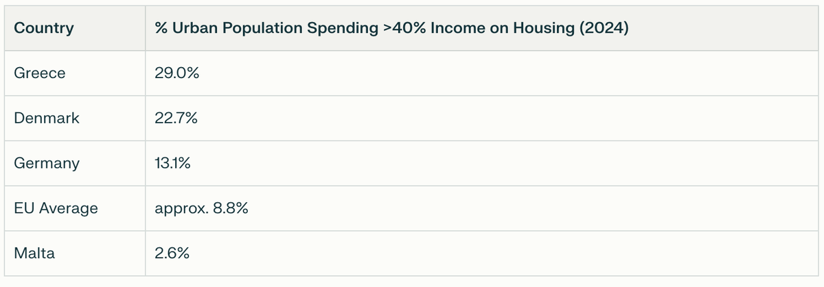 Eurostat’s latest data confirms that housing cost burdens are climbing across European cities, exacerbating concerns in Germany where rent and purchase prices have outpaced wage growth. In comparison, Greece leads the continent, with 29% of city dwellers spending more than 40% of their income on housing, followed by Denmark at 22.7%. Malta remains the most affordable, with only 2.6% affected. Across the EU, the average is around 8.8%, making Germany’s 13.1% significantly above the median.